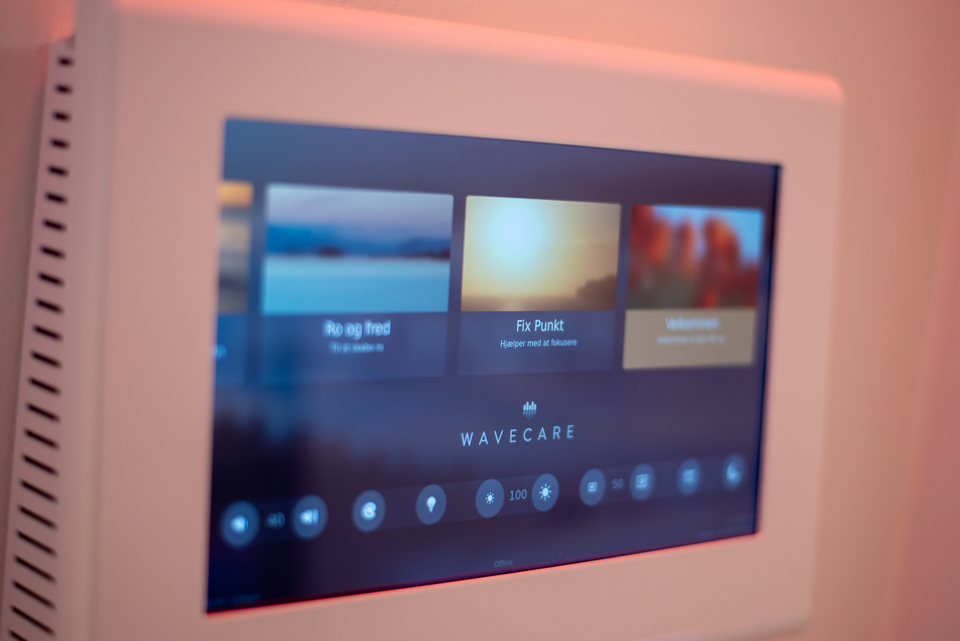 Stuen er udstyret med en sanseskærm med tilhørende lyd og lys. Denne tændes på og styres fra den tablet, der er monteret på væggen. Vi håber på jeres forståelse, hvis personalet ønsker det afbrudt af hensyn til deres arbejde, men ellers så prøv jer endelig frem og find ud af hvad der passer godt til jer. I må meget gerne variere det undervejs i fødselsforløbet, og må også meget gerne bruge det efter fødslen.