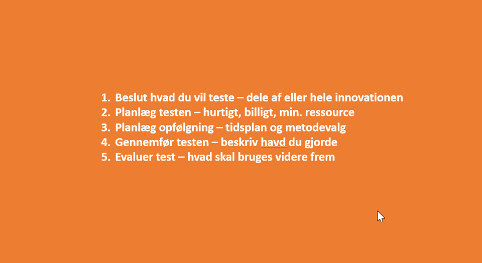 Produktprototype, model, procesforløb, metode afprøves i småskala og justeres