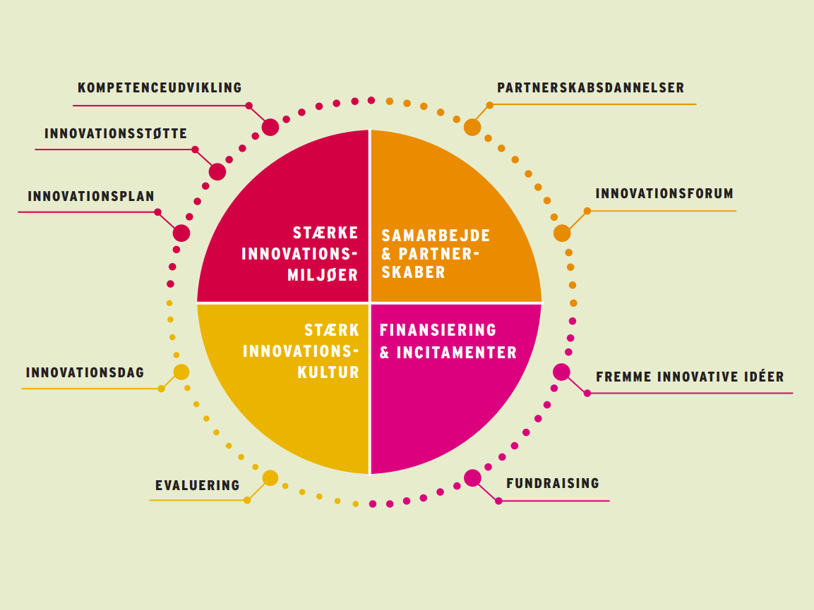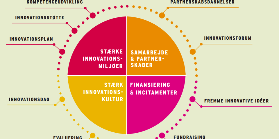 - Styrket innovationsstøtte med organisering af innovationskonsulenter og koordinatorer, samt ERFA-mødefora