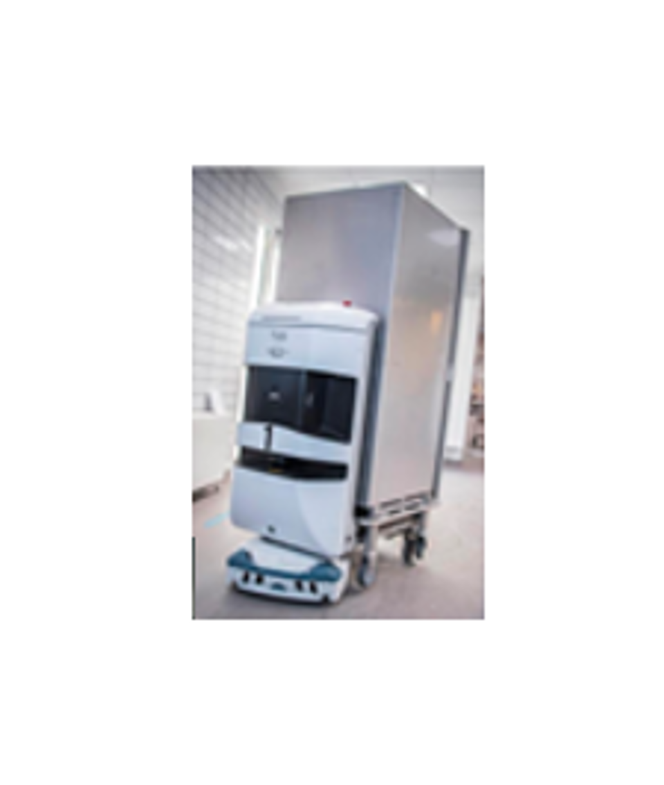 4 TUG-robotter kan selv aflæsse og påsætte transport-boksen. 4 ældre TUG-robotter substituerer ved behov.