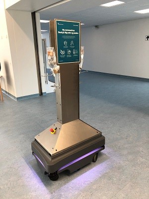 Under covid-19 pandemien kører robotten rundt ganske synlig for alle, der passerer den, og derfor en ekstra reminder til alle om, at nu er man på et sygehus, og derfor skal hænderne have en ekstra tur, så vi i fællesskab kan passe godt på patienterne og sygehusets personale.
