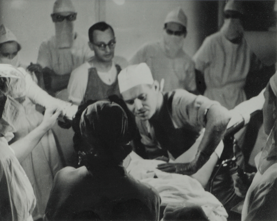 Billede fra en operation, som foretages af den berømte overlæge Ipsen (han står let bøjet over patienten på dennes venstre side).