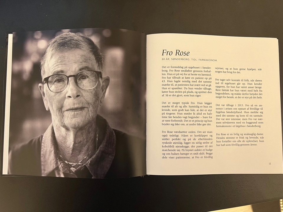 Bogen indeholder 14 historier. En af dem handler fx om 80 årige Fro Rose. Hun er vejviser i Sønderborg. Hun er tidligere farmakonom og hun har været frivillig på Sygehus Sønderjylland, siden det hele begyndte i 2015 og hun var med til at få frivilligheden på sygehuset ordentlig i gang.