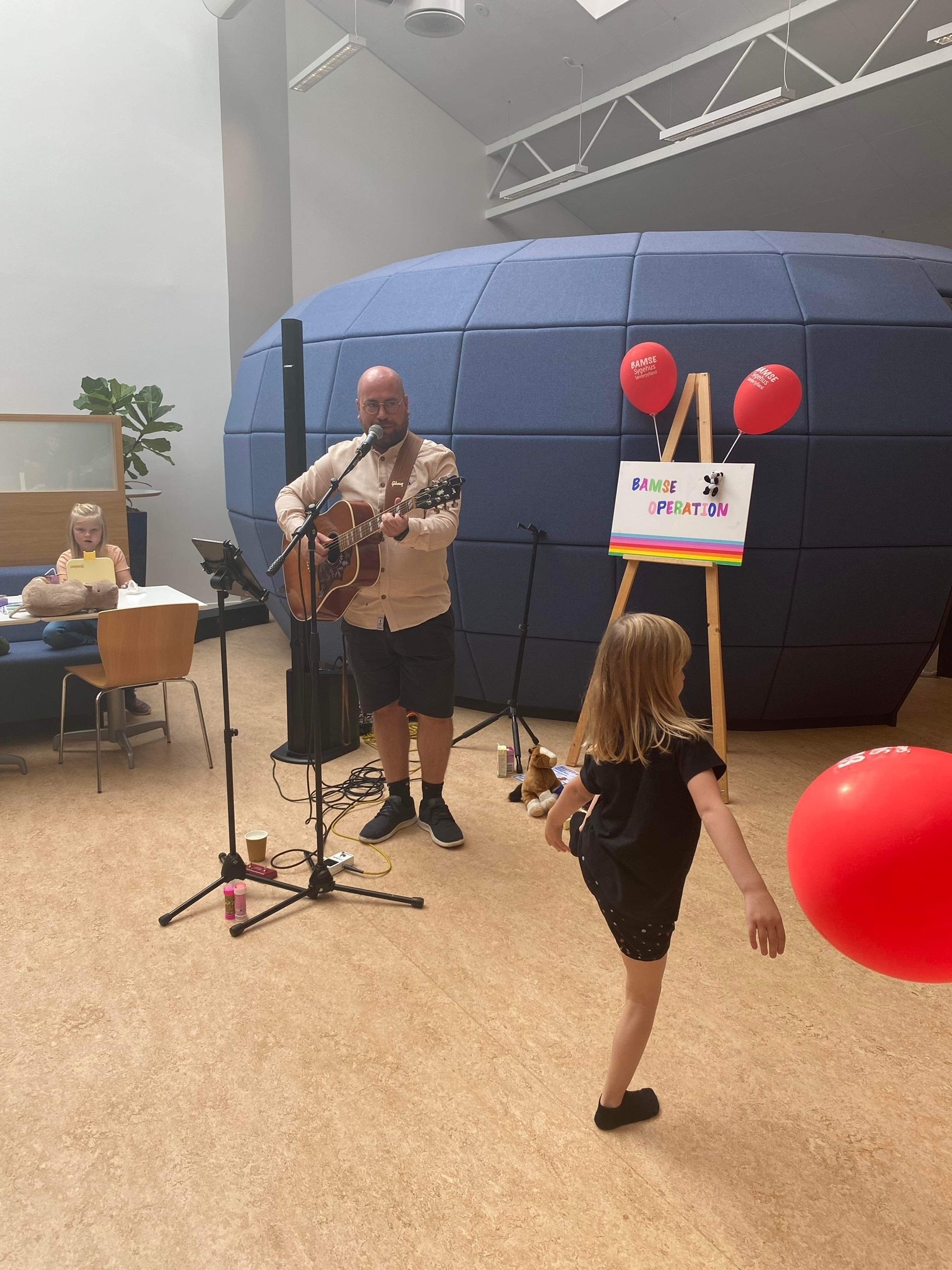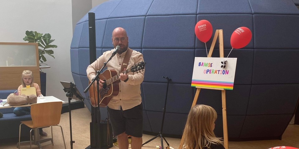 Musiker Mikkel Willerslev fra Ribe stod for at spille og synge børnesange, som optog børn og forældre, mens de ventede i køen på at komme ind til behandling af deres bamser.
