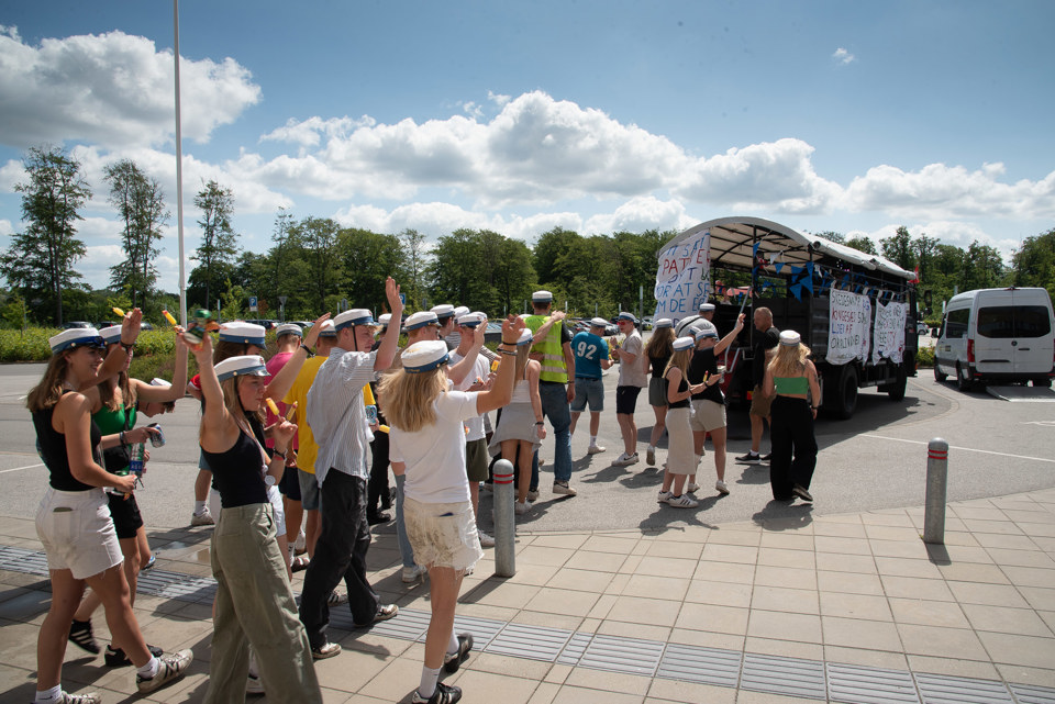 Da klokken rammer 12.15 ankommer en stor bil fyldt med glade og larmende studenter. De dytter, råber, hujer, fløjter og kommer nærmere, mens musikken brager ud. Det er HF studenter fra Aabenraa Statsskole.